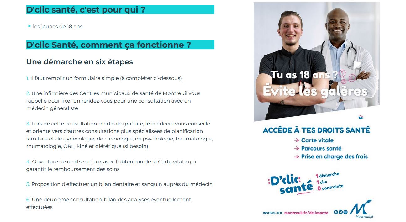 « Offrir un accès privilégié à un parcours de soins au sein d'un centre municipal de santé, c'est vous garantir l'ouverture de vos droits sociaux et un parcours de soins qui réponde à vos besoins en matière d'alimentation, de prévention des conduites à risques et des addictions : tabac, drogues (cannabis, protoxyde d'azote), alcool, de sexualité, contraception, MST, hygiène générale de vie afin que chacun se sente mieux dans sa peau », explique la Ville sur son site. D’clic santé propose ainsi de réaliser un bilan de santé gratuit, d’avoir un accompagnement simplifié pour faciliter ses démarches et l’obtention de sa carte vitale et de bénéficier d’un médecin traitant, référent santé, qui pourra orienter le patient vers des spécialistes.