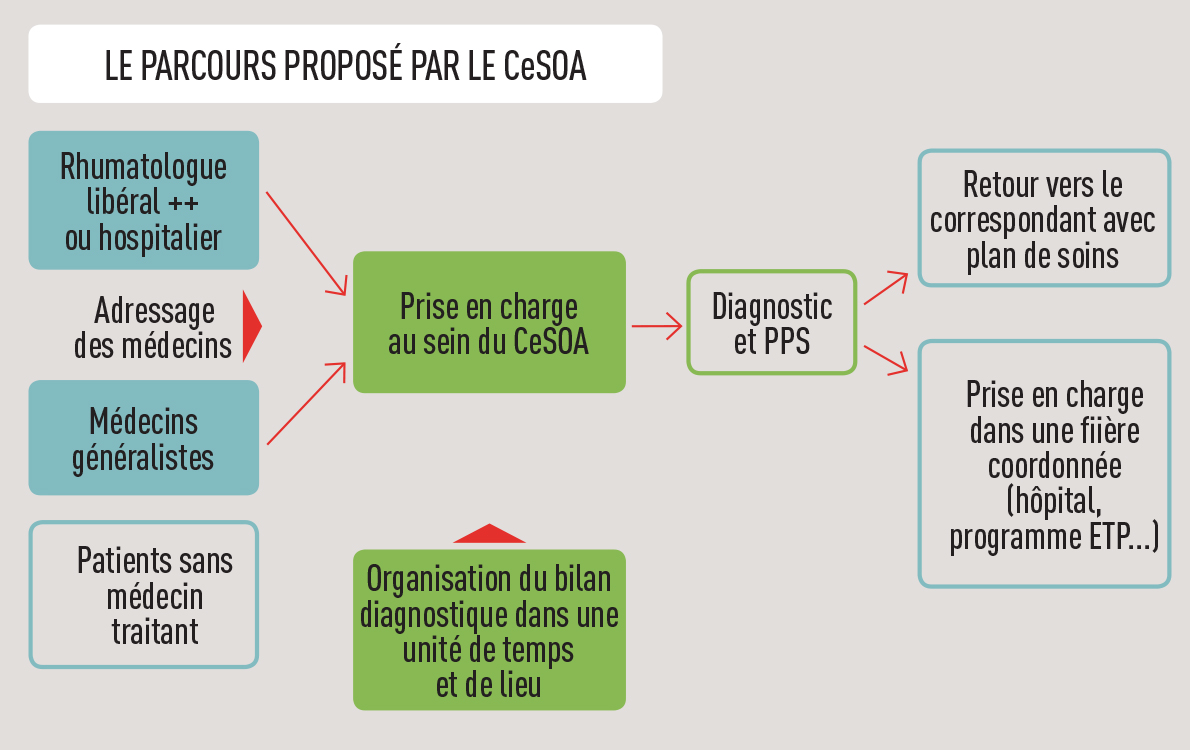 Deux parcours de soins sont proposés : un adressage par le médecin traitant ou le médecin rhumatologue. Et sept scénarios imaginés : bilan d’un rhumatisme inflammatoire débutant, prescription d’une biothérapie, dépistage de comorbidités liées à un rhumatisme inflammatoire, présence de pathologies vertébrales à risque de chronicité, tassement des vertèbres et ostéoporose complexe, arthropathie complexe des membres, et urgences non programmées.