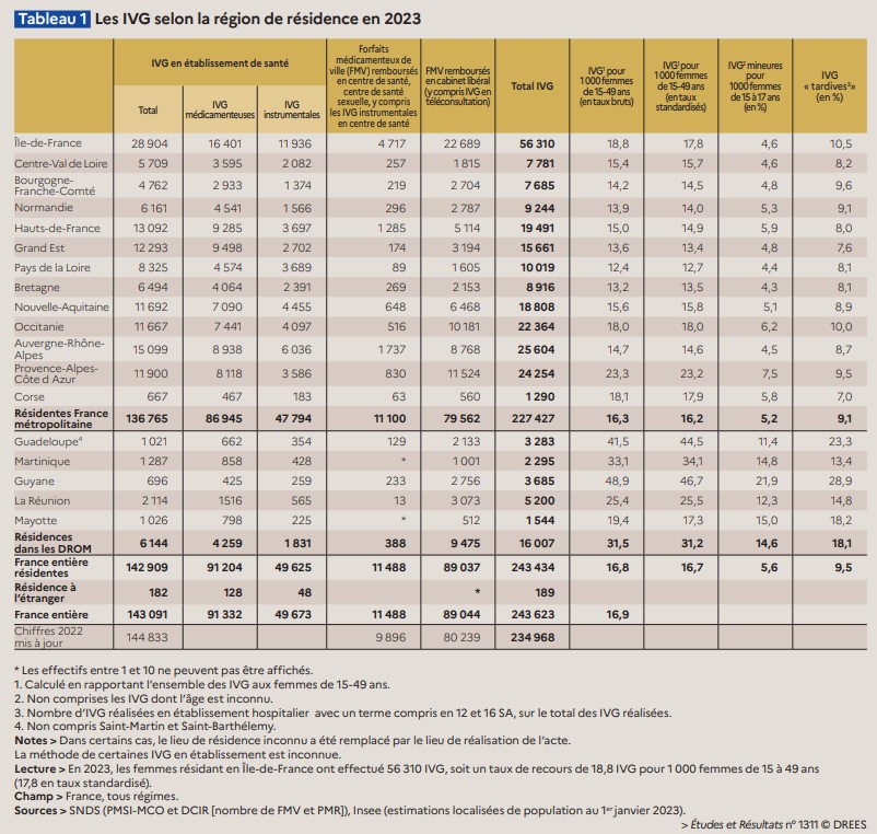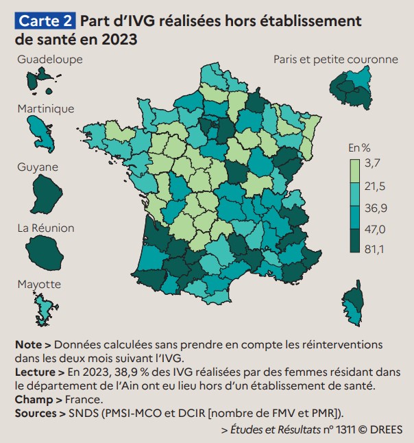 La Drees fait aussi part de disparités géographiques dans le recours aux IVG hors établissement de santé. Dans le département de la Sarthe, par exemple, "aucun médecin ou sage-femme n’a réalisé d’IVG dans son cabinet en 2023", et seulement "5 % des femmes ayant eu une IVG l’ont réalisée hors établissement". En Savoie, en revanche, "plus d’une femme sur deux a réalisé son IVG hors d’un établissement", et en Guyane, 81,1 % des IVG sont réalisées hors établissement de santé.
