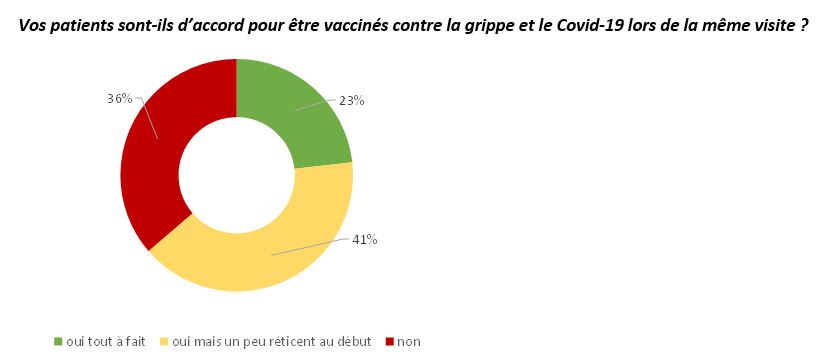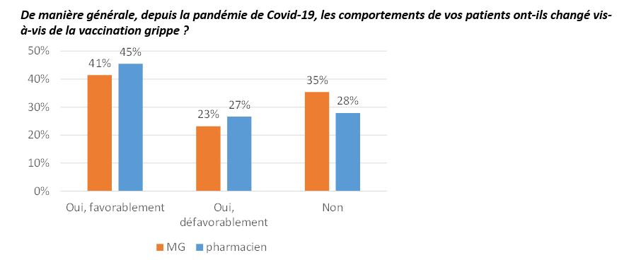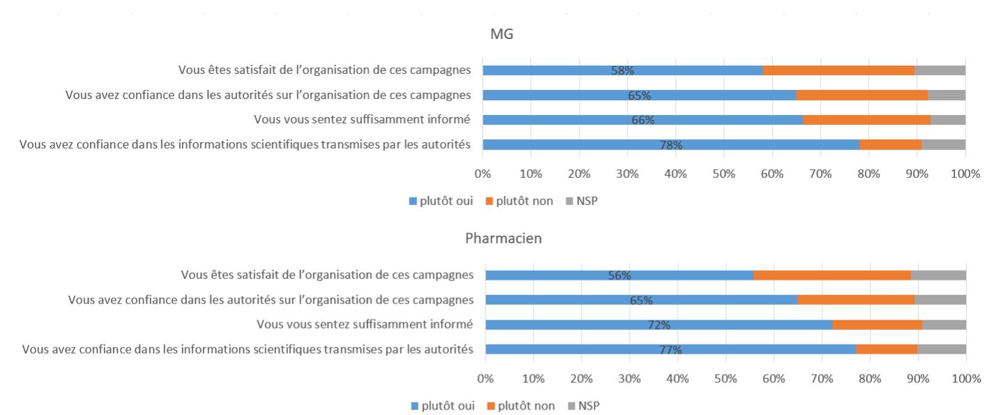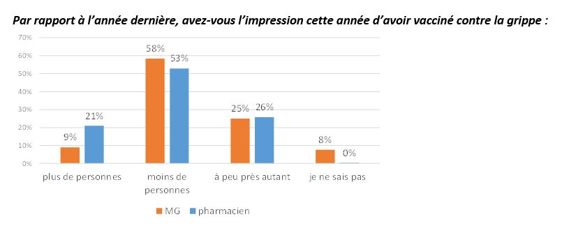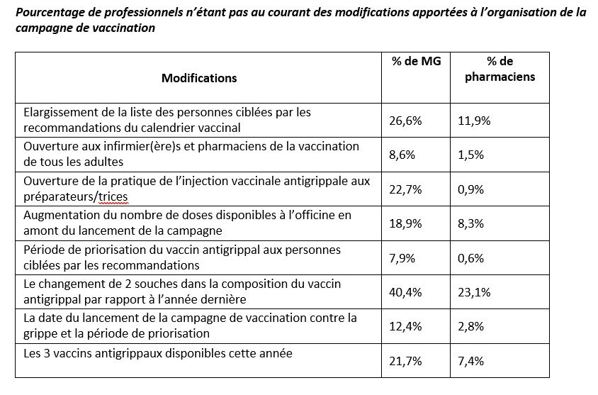 Le défaut d’informations que soulignent les professionnels entraîne un accueil variable, parfois mitigé, de certaines modifications comme l’ouverture de la pratique de l’injection vaccinale antigrippale aux préparateurs (49% des MG et 90% des pharmaciens sont pour) ; la période de priorisation du vaccin antigrippal aux personnes ciblées (44% des pharmaciens et 13% des MG sont contre) ; l’ouverture aux infirmières et pharmaciens de la vaccination contre la grippe de tous les adultes (97% des pharmaciens et 87% des MG sont pour).