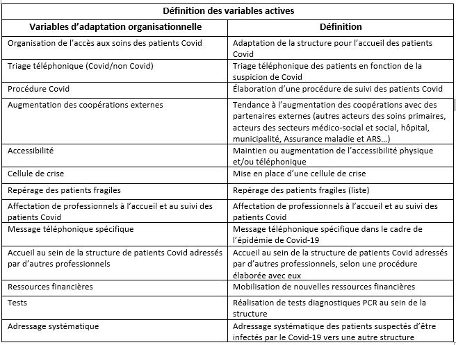A partir de treize variables actives, l’étude propose une analyse des adaptations organisationnelles mises en place par les 340 structures (263 maisons et 77 centres de santé) répondantes :