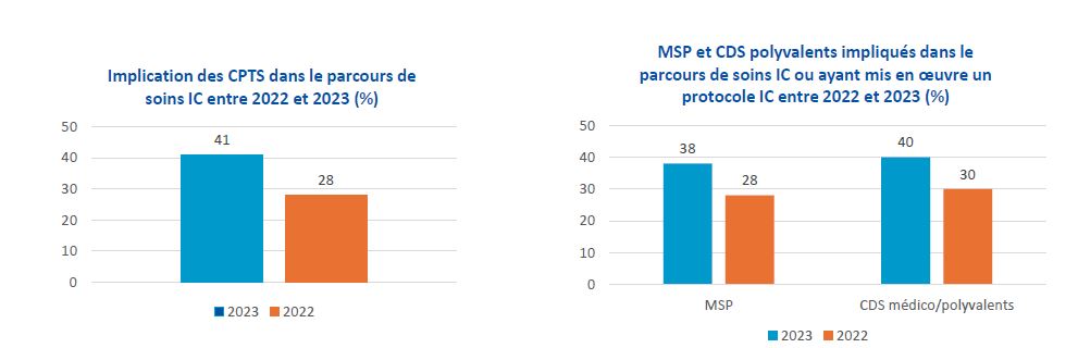 Structuration d’un parcours de soins avec les partenaires (établissements de santé, cardiologues, médecins libéraux, IPA, infirmières libérales, pharmaciens, kiné, etc.), organisation de formations animées par des cardiologues, mise en place de référents IC qui forment les professionnels de santé, élaboration de protocoles de coopération, mise en place d’actions d’information et de prévention auprès de la population du territoire… En 2023, 41% des CPTS se sont impliquées dans le parcours IC (contre 28% en 2022). Des chiffres en hausse également pour les maisons de santé (38% en 2023 contre 28% en 2022) et des centres de santé polyvalents (40% contre 30%), qui se sont approprié l'un des segments du parcours, "que ce soit le diagnostic en ville, le suivi post-hospitalier, la vérification de la bonne administration du traitement", a détaillé Philippe Tangre lors d'une conférence de presse le 11 septembre dernier : "Les acteurs de soin se sont mis autour d'une table, ils se sont dit : 'On a les données de l'Assurance maladie, on a un réseau de cardiologues, on a un réseau de gériatres, on a une vraie problématique dans notre bassin territorial, on va donc faire en sorte de sécuriser le parcours de soin, et de serrer les boulons au niveau de la coordination des soins."