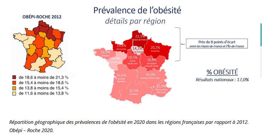 L’obésité et le surpoids sont également plus fréquents dans les catégories sociales défavorisées, comme l’indique l’étude Obépi 2020 : la prévalence de l’excès de poids est de 51,1 % chez les ouvriers, 45,3 % chez les employés, 43 % chez les professions intermédiaires et 35 % chez les cadres. Une tendance similaire pour l’obésité : 18% chez les ouvriers et 17% chez les employés (17,8 %) mais 9,9% chez les cadres. Les professions intermédiaires ont, elles, une prévalence d’obésité de 14,4 %. Des chiffres en hausse depuis 1997 dans toutes les catégories professionnelles.