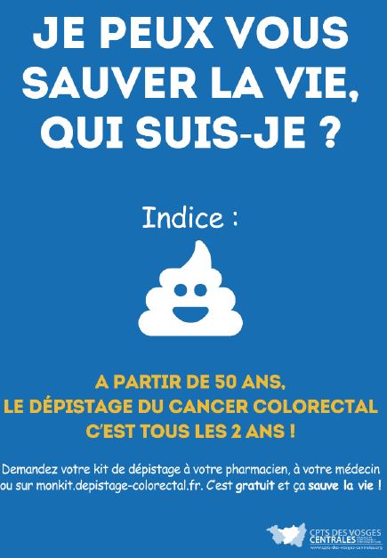Et pour rendre cette campagne plus percutante, la CPTS des Vosges centrales a choisi d'inclure cette question et un petit visuel – représentant les selles – pour "bien marquer les esprits et rappeler que le dépistage est simple à réaliser et à la portée de tous", rappelle précise Camille Requena, coordinatrice de l'organisation territoriale contactée par Concours pluripro. Car le kit de dépistage peut être commandé en ligne ou retiré auprès d'un médecin ou d'un pharmacien, rappelle le communiqué de la CPTS.