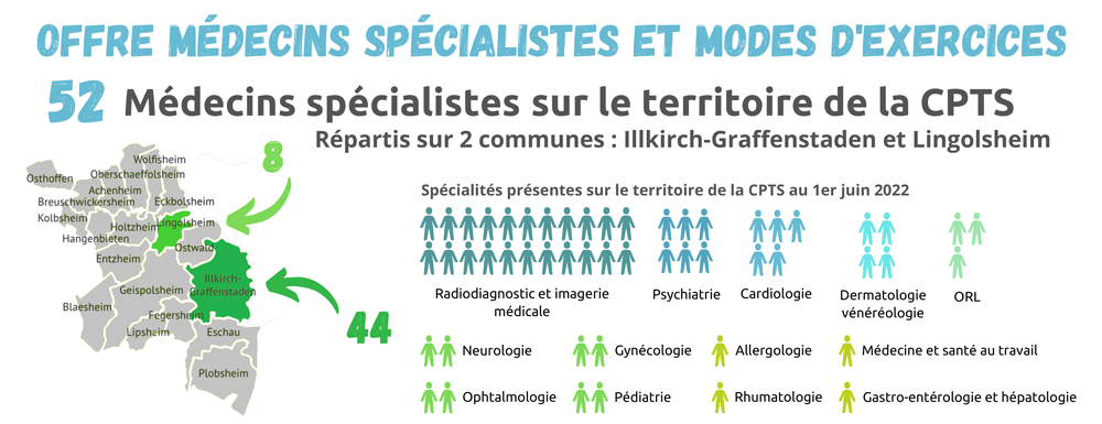 La population de la CPTS comprend 26,4 % de patients âgés de plus de 60 ans (la moyenne nationale étant de 25,8 %) et 17 % de moins de 15 ans. La moyenne d'âge est plus élevée sur les communes d'Achenheim, Blaesheim et Oberschaeffolsheim. L'étude révèle également que les communes qui nécessitent le plus de soins spécialisés – en raison de l'âge des habitants, de la proportion de personnes en ALD ou de bénéficiaires de médecins spécialistes – font partie de celles qui sont le plus isolées en termes de distance : un patient doit ainsi parcourir près de 15 km en moyenne pour consulter un stomatologue ou un pneumologue. "On se rend compte d'une certaine inégalité territoriale au sein des 19 communes de la CPTS. L'âge avancé des médecins spécialistes, la disparité géographique de leur lieu d'exercice ou encore l'absence de certaines spécialités sont tant d'éléments à prendre en compte et à corriger pour satisfaire encore davantage les besoins en soins de second recours des habitants du territoire", note l'étude.