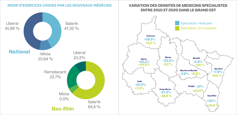 Entre 2010 et 2020, le choix de mode d'exercice des nouveaux médecins a évolué en faveur du salariat (-10,68 % de libéraux et +11,68 % de salariés). En témoigne également un sondage réalisé auprès des internes : si près de 30 % envisagent un exercice mixte, près de 20 % considèrent le salariat, mais à peine 5 % opteraient pour un exercice libéral exclusif. "L'un des problèmes qu'on voulait porter également à travers cet état des lieux, c'est l'hyperspécialisation des médecins spécialistes. Par exemple, les pédiatres sont contraints de choisir une surspécialité – la pédiatrie générale n'existe plus. Donc typiquement, un gastropédiatre ne choisira pas de s'installer en ville mais optera pour le plateau technique hospitalier…"