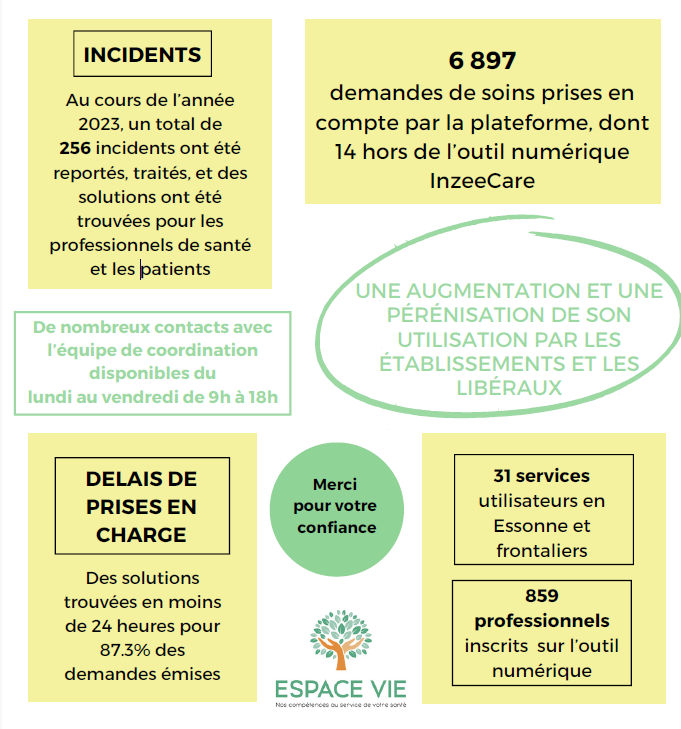 Elle a déjà permis de prendre en charge “plus de 70.000 patients" depuis 2017, assure Espace Vie dans un communiqué publié le 23 février dernier. Et l’an dernier, la Plateforme de Coordination lancée par l’association qui accompagne et participe au développement des actions de deux CPTS en Essonne (Santé Seine Essonne et Sud Hurepoix), a enregistré plus de 6.800 demandes de prise en soins, notamment grâce à l'outil numérique InzeeCare. "Des solutions [de prise en charge, NDLR] trouvées en moins de 24 heures pour 87,30 % des demandes émises", se vante l'association.