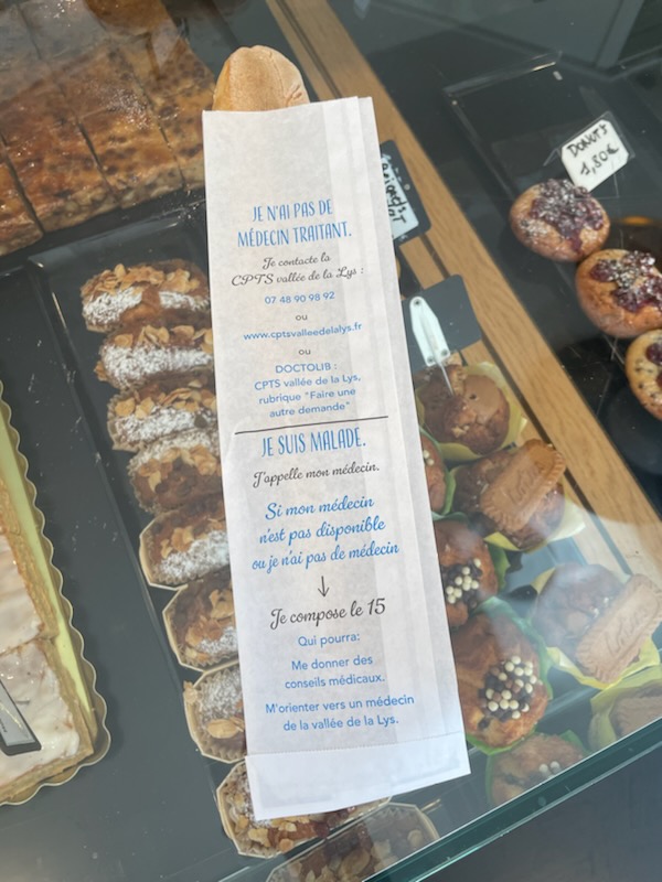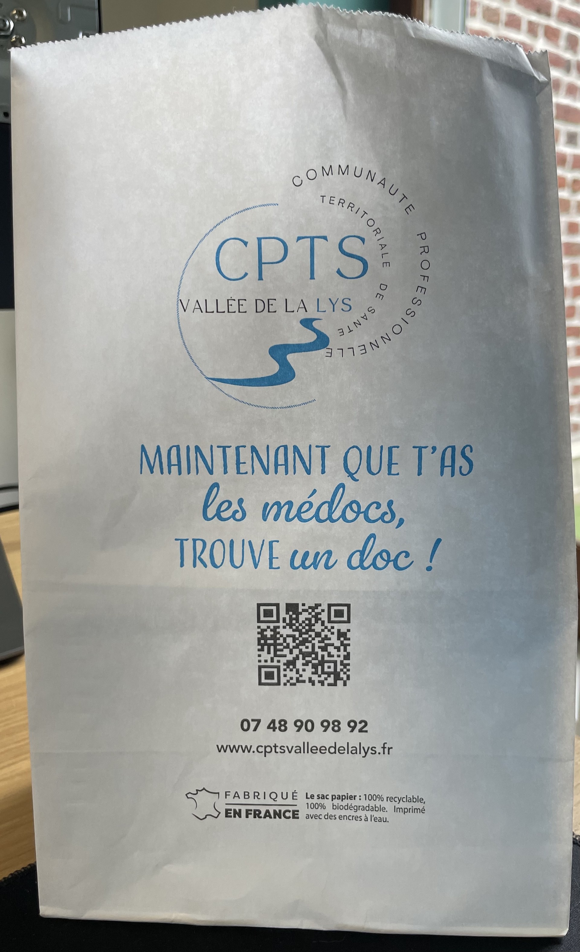 Le ton est donné ! Depuis trois mois, les professionnels de santé des neuf communes de la Métropole européenne de Lille – qui constitue le territoire de 75.000 habitants de la CPTS Vallée de la Lys (Hauts-de-France) – a trouvé un moyen innovant pour sensibiliser les patients à la présence de médecins sur le territoire. Comment ? En imprimant directement sur des sacs à baguettes et des sacs à pharmacie les slogans "Trouver un médecin ne mange pas de pain" et "Maintenant que t'as les médocs, trouve un doc !". Objectif : aller chercher les 5% de patients sans médecin traitant sur son territoire, explique à Concours pluripro Thomas Maunoury, médecin généraliste, vice-secrétaire de la CPTS Vallée de la Lys, et co-responsable des missions "Soins Non Programmés et accès médecin traitant". "Le nouveau bureau de la CPTS de taille 2 a repris la gestion depuis trois ans. Et nous avons déterminé, avec la CPAM, les deux missions socles : gérer les soins non programmés et faciliter l'accès à un médecin traitant", détaille-t-il.