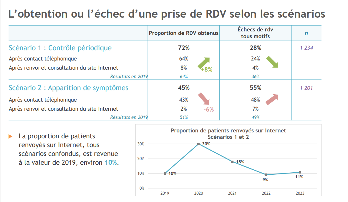 L’étude révèle également que la prise de rendez-vous sur internet, proposée par 62% des ophtalmos, joue un rôle crucial dans la diminution des délais. Ces derniers sont en général plus courts que par téléphone (41 contre 48 jours en moyenne), et la proportion de rendez-vous obtenu y est par ailleurs légèrement supérieure (77% contre 72%).