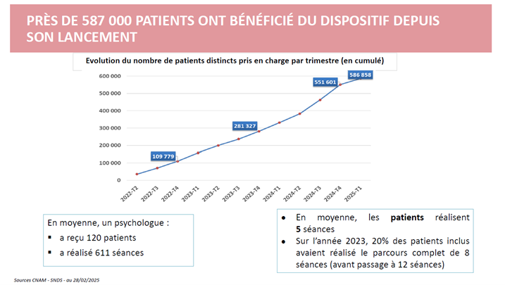 En termes de dépenses, l'enveloppe totale dépensée pour les soins du dispositif s'élève à 118 millions d'euros, dont 74,8 millions d'euros pris en charge par la Cnam. "L'offre a évolué et sera sans doute amenée à évoluer encore", indique Marguerite Cazeneuve qui précise que "l'objectif est d'avoir un partenariat entre le médecin et le psychologue. L'enjeu est avant tout de déstigmatiser la santé mentale et de faire prendre conscience qu'il n’est pas nécessaire d'avoir une pathologie très lourde pour obtenir des soins remboursés."