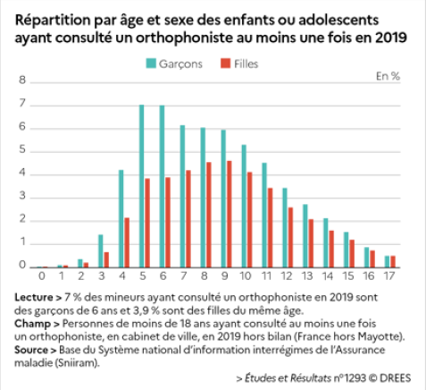 En 2019, en France (hors Mayotte), près de 1 250 000 enfants ou adolescents de moins de 18 ans ont consulté au moins une fois un orthophoniste, pour plus de 21 millions de consultations au cours de l’année, indique la Drees. La moitié d’entre eux sont âgés entre 6 et 10 ans et sont scolarisés à l’école primaire. Les garçons consultent davantage que les filles (59 % vs 41 %) et ont recours plus jeunes à l’orthophoniste : 5 et 6 ans chez les garçons et 8 et 9 ans chez les filles.