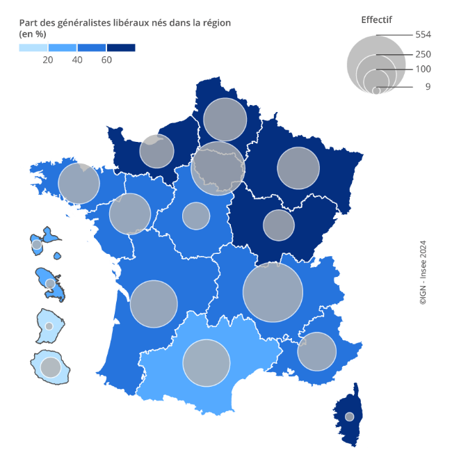 Les régions Hauts-de-France, Île-de-France et Grand-Est montrent le plus fort taux (environ 80%) de médecins généralistes libéraux installés dans leur région de naissance. "Le lieu de l'internat est aussi un des principaux déterminants du lieu d'installation", poursuit l'étude. Dans le sud de l’hexagone, la faculté médecine de Nice se démarque : en moyenne 18 km séparent le lieu d’exercice des médecins de leur université de formation. Cette distance "atteint 35 km pour l'université de la Réunion : plus des trois cinquièmes des généralistes libéraux de cette génération ayant effectué leur internat à la Réunion y étant installés".