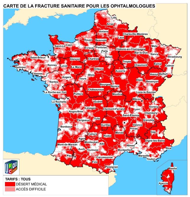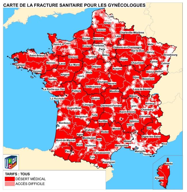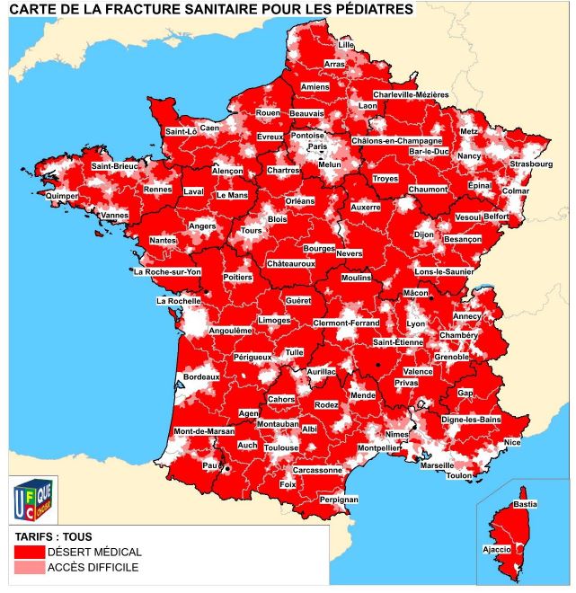 C’est sa troisième étude sur la fracture sanitaire – après celles de 2012 et 201 – et dans sa première édition, l’UFC-Que Choisir tirait déjà la sonnette d’alarme sur les déserts médicaux, constatant "la présence d’une alarmante fracture sanitaire territoriale (manque de médecins) et financière (manque d’accès aux praticiens respectant le tarif conventionné de la Sécurité sociale) par rapport à la demande potentielle de consultations liée à la démographie des patients". Une fracture sanitaire qui est "plus que jamais une préoccupation" car "un quart des femmes et un quart des enfants vivent respectivement dans un désert médical gynécologique et un désert médical pédiatrique" et que l’accès à un médecin généraliste est "particulièrement difficile pour pas moins de 15,3 millions d’habitants de notre pays". Pire, estime l’association, "dès lors qu’on intègre le critère financier à la fracture sanitaire (à savoir pouvoir accéder à un médecin ne pratiquant pas de dépassements d’honoraires), quasiment toute la France devient un désert médical pour l’accès à un spécialiste". Une situation qui va "inexorablement s’aggraver si les pouvoirs publics persistent à ne pas mettre en place de véritables réformes, et notamment un strict encadrement des tarifs, indispensable pour limiter le renoncement aux soins".