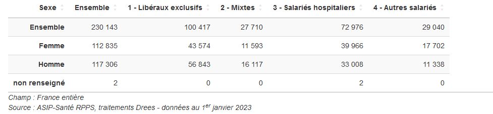 De plus, sur les 338.731 médecins (toutes activités confondues, dont 154 750 femmes), 93.560 exercent en cabinet de groupe, 8.823 en centre de santé (dont 4.548 femmes), 10.134 dans le secteur de la prévention, et 48.114 en cabinet individuel.