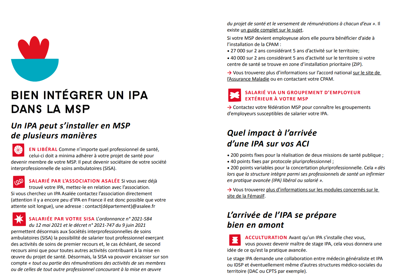 Afin d’aider aux mieux les IPA dans leur installation, le guide comporte des fiches détaillant l’organisation, le fonctionnement et les spécificités de chaque structure de santé (MSP, CPTS, DAC et EHPAD).