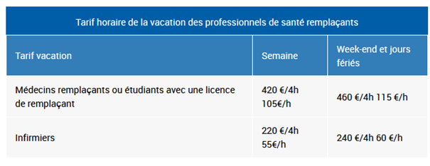 > Les médecins libéraux ou exerçant dans un centre de santé toucheront un forfait de 105 euros de l’heure en semaine ou 420 euros par demi-journée d’activité d’une durée minimale de quatre heures. Ce forfait passe à 115 euros de l’heure le samedi après-midi, le dimanche et les jours fériés, ou 460 euros par demi-journée d’activité d’au-moins quatre heures.