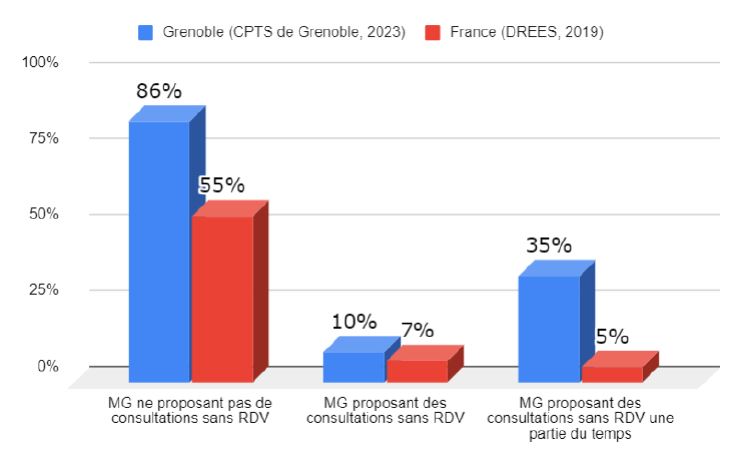 > Si au niveau national, 82% des MG proposent une prise en charge de soins non programmés au quotidien, à Grenoble, 93,5% réalisent quotidiennement des soins non programmés avec ou sans rendez-vous. La faible densité médicale sur la commune explique que les soins non programmés soient essentiellement réservés à la patientèle "MT" : 65 % des MG réservent leurs consultations de soins non programmés à leur patientèle "MT" ; 16,3% ouvrent leurs consultations à tous ; 9,3 % réservent ces consultations à une patientèle sans MT.