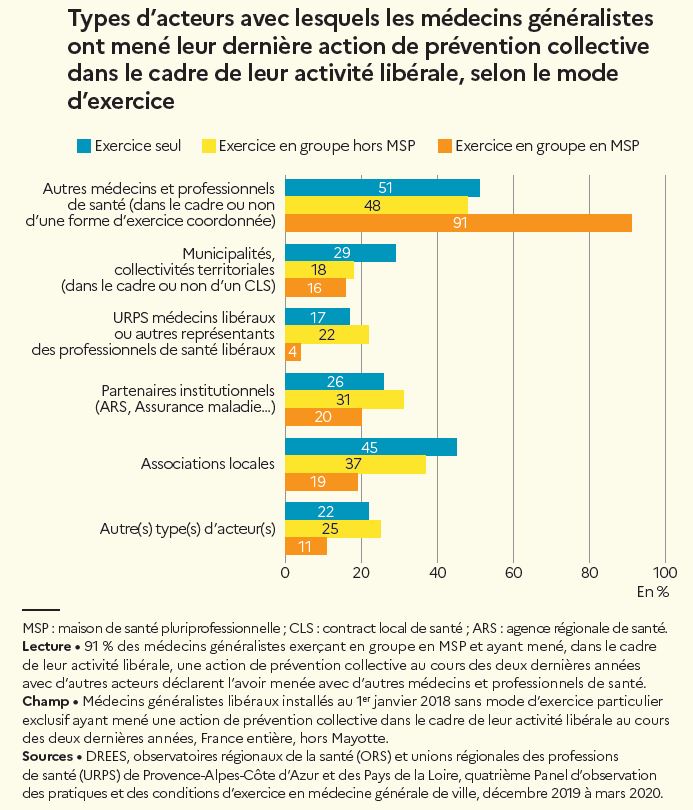 Quel que soit leur mode d’exercice, les médecins citent le plus fréquemment, comme acteurs et partenaires, les autres médecins et professionnels de santé, notamment pour ceux exerçant en MSP. Ils citent moins souvent l’implication des autres types d’acteurs, comme les associations locales ou les partenaires institutionnels, note la Drees.