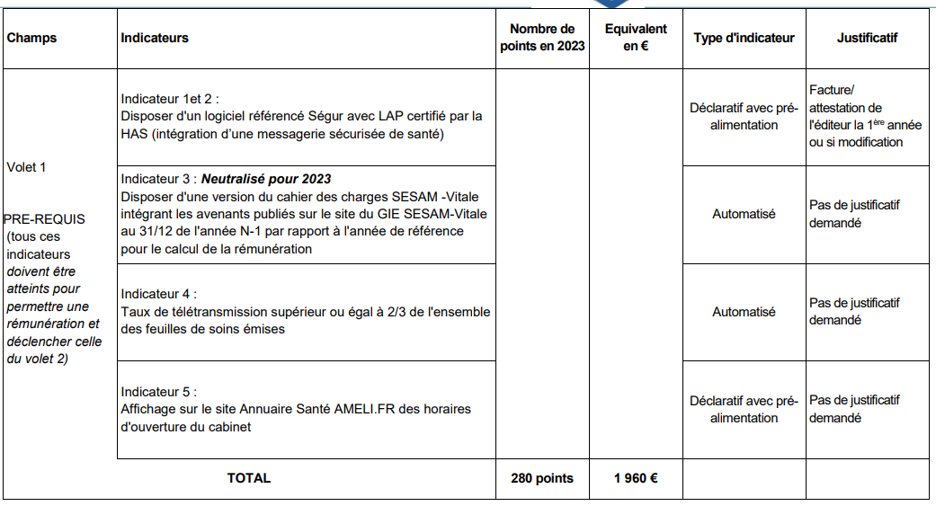 Côté forfait structure, plusieurs "nouveautés" sont signalées par la Cnam. L'équipement par un logiciel référencé Ségur devient un indicateur socle du volet 1. Les médecins ont jusqu'au 31 janvier 2024 pour se mettre en conformité. En revanche, l'indicateur concernant la participation à un exercice coordonné, qui avait été neutralisé l'an dernier dans le volet 1, est transféré au volet 2 -optionnel.