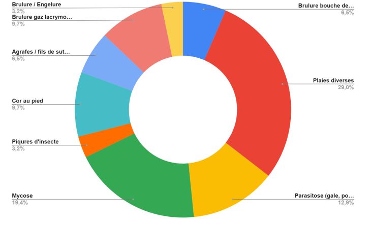 Parasitose, problèmes dentaires, traumatismes divers… Comme les jeunes présentent divers problèmes de santé – dont des problèmes dermatologiques (38% des consultations en 2020) –, un projet de démarche qualité, financé par l’ARS et porté par la Fédération des maisons et pôles de santé en Île-de-France (Fémasif), a été mis en place. Objectif : améliorer la qualité des soins (guérison, problème résolu) et l’accès à des consultations médicales et de podologie (à horaires fixes et réguliers à la PAJ), et mettre en œuvre des protocoles de soins infirmiers définis collectivement. L’équipe a également développé un outil de suivi sur les jeunes patients, et a mis en place un appel téléphonique à J+7 pour s’assurer de l’état de guérison.