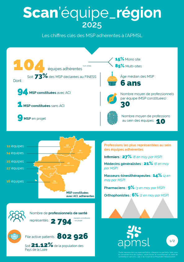 104 équipes pluriprofessionnelles recensées en Pays de la Loire, dont 85% en multisites. Dans la région, les maisons de santé continuent de se développer, assure l'Association pour le développement de l'exercice coordonné pluriprofessionnel en Pays de la Loire (APMSL), dans son édition 2025 du Scan’équipe Région. Soit 27 équipes en Loire-Atlantique, 25 en Maine-et-Loire, 16 en Vendée, 14 dans la Sarthe et 12 équipes en Mayenne. "En tout, on compte 27 MSP de plus dans notre réseau qu'en 2023", se réjouit Vincent Renoir, responsable communication de l'APMSL.