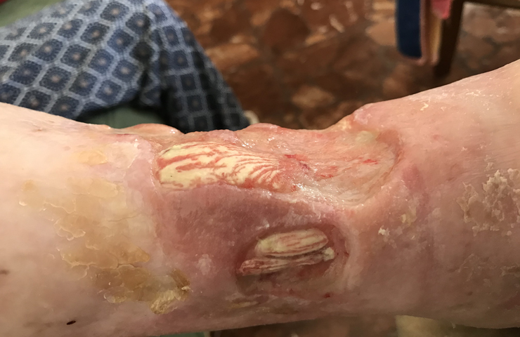 La patiente a comme antécédents une HTA essentielle, une dyslipidémie, un trouble anxiodépressif et des troubles cognitifs. Elle vit seule, mais ses enfants restent présents. Elle est autonome, dynamique, ne fume pas et consomme 10 g d’alcool par jour. Elle suit un traitement par Coaprovel, Doliprane, Uvédose et pravastatine. Son ulcère s’aggrave depuis quatre à six semaines et est extrêmement creusant, prenant quasiment en circonférence toute la cheville droite.