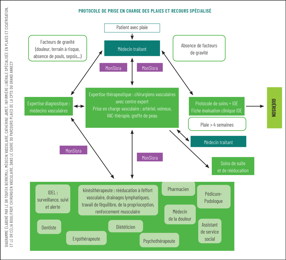Le praticien va tout d’abord faire un état des lieux précis de la plaie afin d’avoir un suivi qualitatif par la suite en relevant les éléments suivants : superficie (échelle en centimètres), caractère creusant, sec ou suintant (qualité et quantité de l’écoulement, fibrine), la présence de nécrose, l’échelle colorimétrique, la douleur, la qualité de la peau périlésionelle (dermite ocre, eczéma, oedème, inflammation), la date de début, son caractère récidivant et les soins en cours. Il est de plus souhaitable de réaliser une photo de la plaie à insérer dans le dossier. Un examen vasculaire va ensuite mesurer les indices de pression systolique (rapport entre la tension artérielle au mollet et en huméral), la présence de pouls, une masse battante abdominale, le temps de recoloration cutanée et la sensibilité ainsi que la motricité des membres inférieurs. L’examen comprend également l’analyse de la marche de la patiente, c’est-à-dire le déroulé du pas, l’équilibre et la proprioception, la qualité du chaussage et la tonicité.