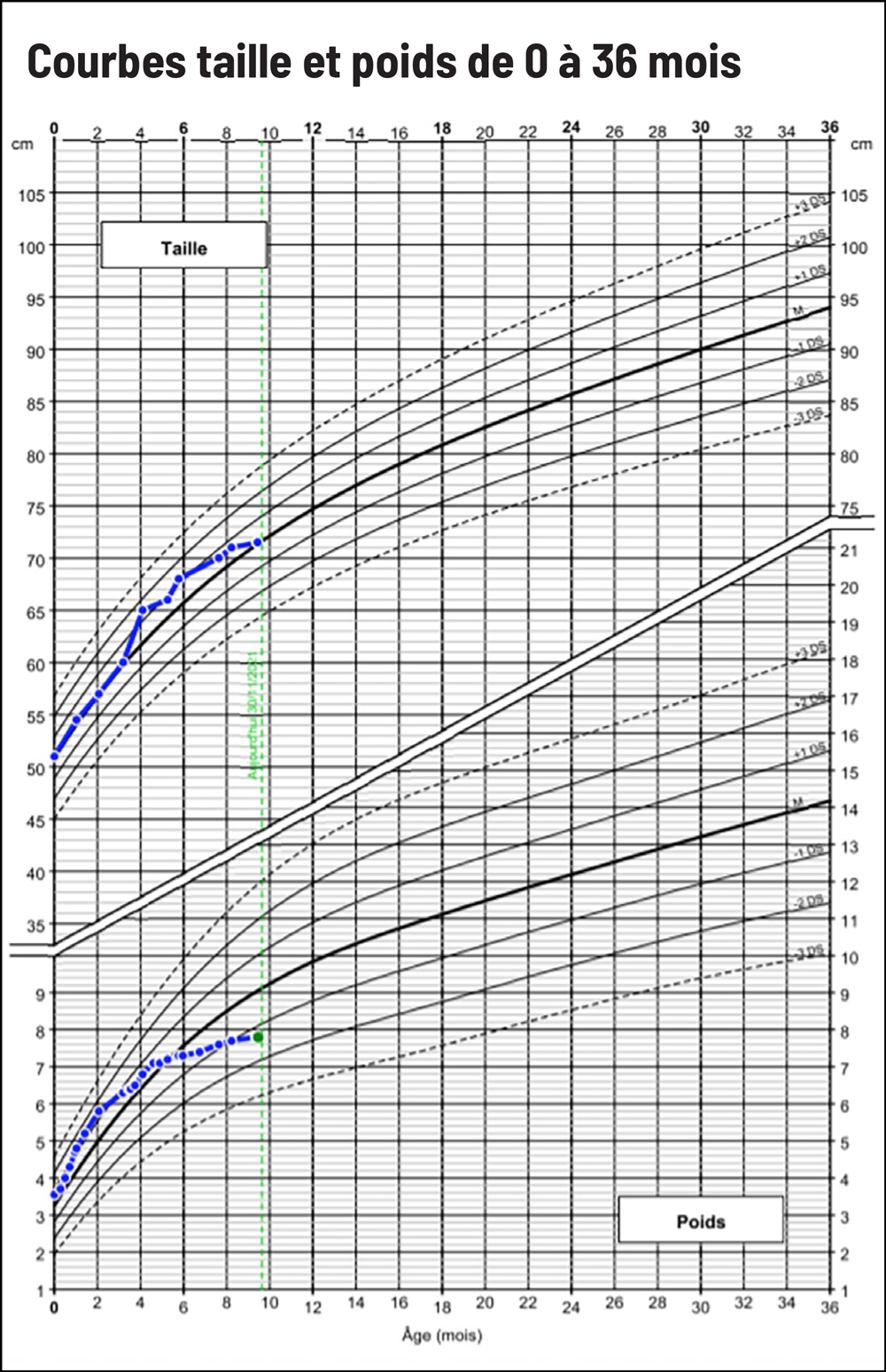 Courbes de croissance : les mesures du poids, de la taille et du PC de chaque consultation sont rapportées sur les courbes de croissance en fonction du sexe présentes dans le carnet de santé de l’enfant. En effet, la cinétique de la croissance est un des éléments primordiaux dans le dépistage de la dénutrition. Il existe des courbes spécifiques pour le poids et la taille entre 0 et 3 ans en complément des courbes entre 0 et 18 ans.