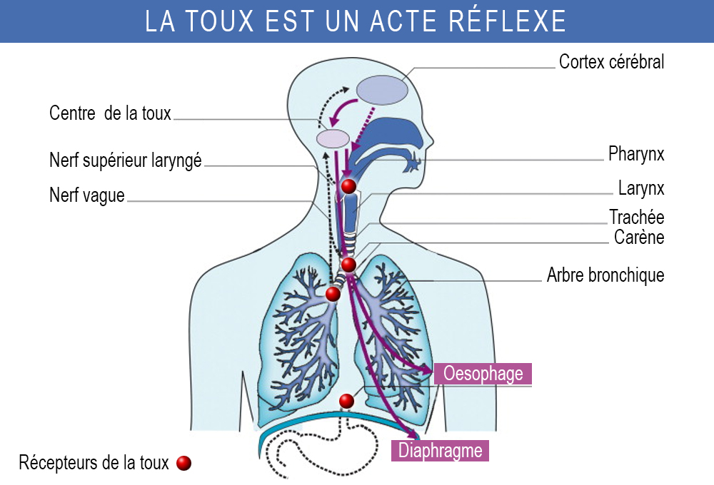 La toux est un acte réflexe protecteur des voies aériennes mis en jeu pour permettre l’extériorisation des expectorations bronchiques ou pour éviter l’intrusion dans les voies respiratoires de composés pouvant provoquer des lésions de l’appareil respiratoire.