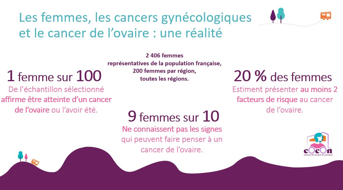 En France, le cancer de l’ovaire touche 1 femme sur 70 : c'est le 8e cancer le plus fréquent et la 4e cause de décès. En 2018, l’Inca a relevé 5 193 nouveaux cas et 3 479 décès… Selon un sondage réalisé par le laboratoire GSK auprès de 2 406 femmes, dont 200 par région, 90 % affirment ne pas connaître les signes qui pourraient faire penser à un cancer de l’ovaire et 70 % ne se sentent pas suffisamment informées sur les cancers gynécologiques.