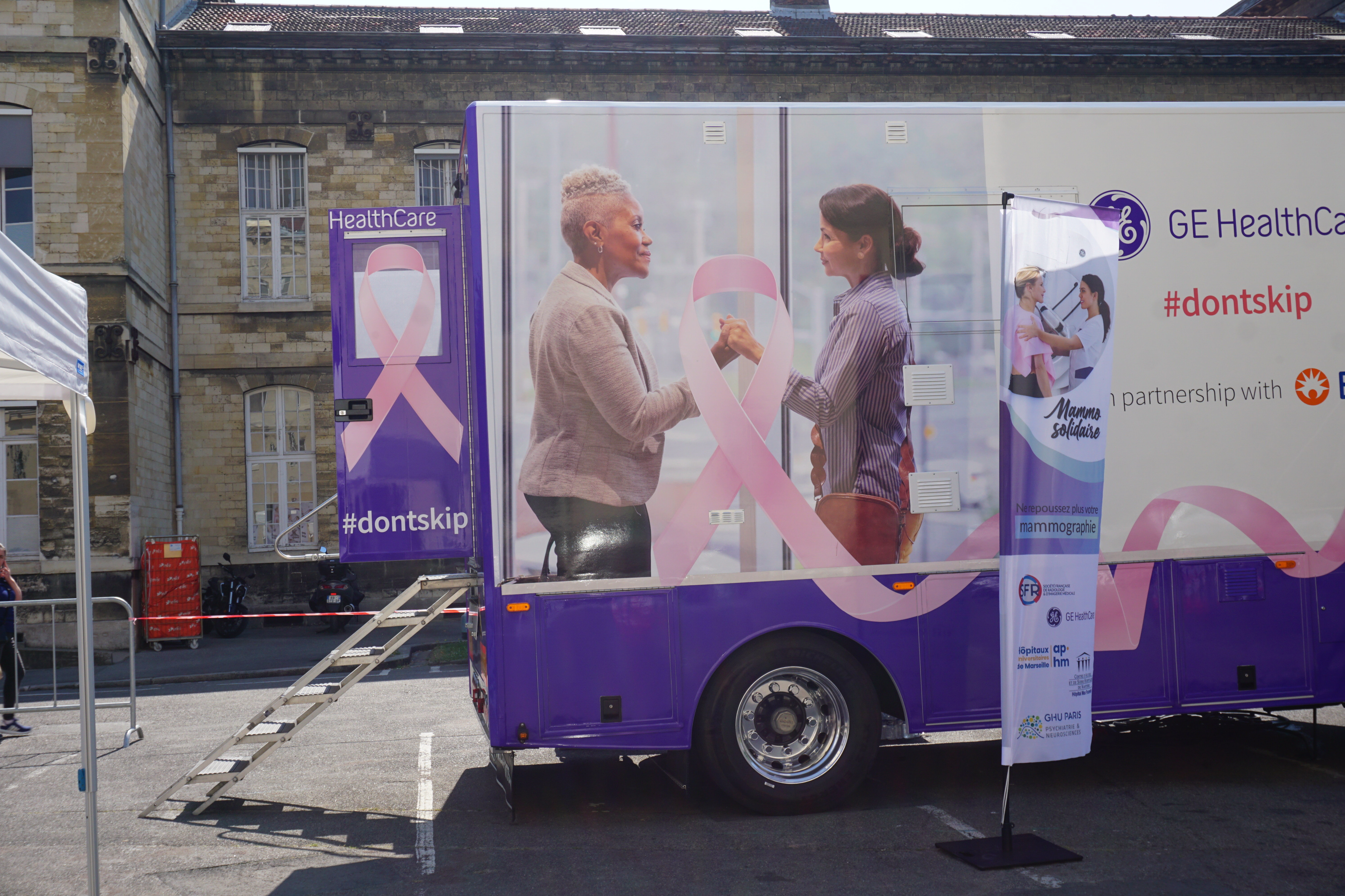 Jeudi 8 juin, 9 heures 30, le camion itinérant de l’opération "Mammo Solidaire" est stationné près du pavillon Mangan du service psychiatrique de l’hôpital Saint-Anne, dans le XIV arrondissement de Paris. À peine revenu d’Allemagne, le camion est de nouveau mobilisé pour une campagne de dépistage, cette fois un peu particulière puisqu’elle s’adresse à des femmes "précaires", "ayant des difficultés d’accès aux soins". À l’origine de cette initiative, la Société française de radiologie (SFR) qui s'est basé sur un rapport de la Dress (l'état de la population française), paru en septembre 2022. "En 2019, il y a presque 40 % des femmes en âge d’avoir un dépistage, dans les 24 % les plus précaires, qui n’ont jamais fait de dépistage ou qui ont une mammographie de plus de deux ans. Elles ne sont que 24 % chez les plus aisées" rappelle Alain Luciani, secrétaire générale de la SFR, qui rappelle par ailleurs que "la précarité sociale, au sens large, est une source de moindre accès aux soins […]. Il y a des situations médicales particulières qui éloignent les patientes […] du dépistage".
