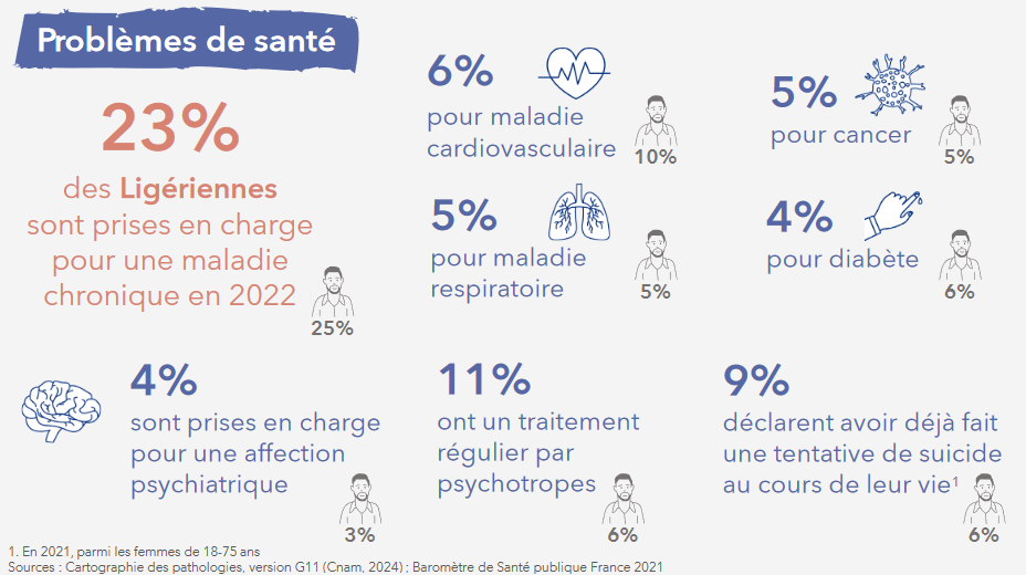 En 2022, 23% des femmes de la région étaient prises en charge pour une maladie chronique (contre 25% des hommes) dont 11% ont un traitement régulier par psychotropes (contre 6% des hommes) et 9% déclarent avoir déjà fait une tentative de suicide au cours de leur vie. De plus, 6% des femmes sont suivis pour une maladie cardiovasculaire et 5% pour une maladie respiratoire ou un cancer.