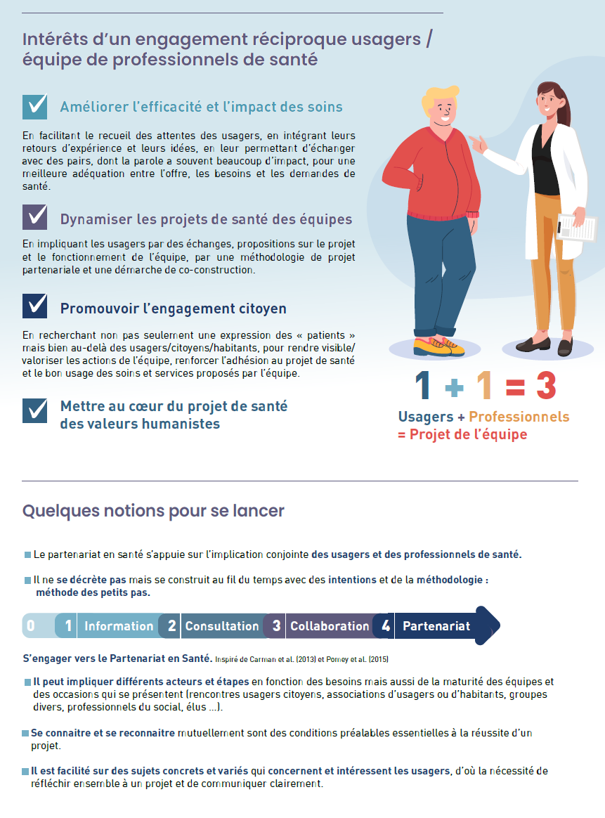 Le manuel offre des conseils pratiques, des exemples et des ressources pour développer l’implication des usagers dans les MSP et auprès des ESP. Il explique point par point l’intérêt d’un "engagement réciproque usagers/équipe de professionnel de santé", et dévoile les notions nécessaires pour se lancer dans ce partenariat. Il explique l’importance d’une sensibilisation préalable auprès des professionnels de santé, en s’appuyant sur des personnes ayant déjà fait l’expérience avec les usagers (pour mieux faire percevoir les rôles/missions possibles, bénéfices pour les usagers mais aussi pour les professionnels).