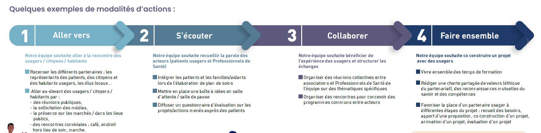 Le guide expose ensuite les bonnes pratiques primordiales à mettre en place pour un partenariat réussi : se rencontrer avant de commencer le travail, mettre en place un cadre bienveillant, remettre en question ses pratiques, penser à l’implication du patient au-delà de la problématique du soin…Plusieurs modalités d’actions sont proposées, en fonction du besoin de la structure de santé (rencontrer les usagers, recueillir leur parole, bénéficier de leur expérience ou co-construire un projet).