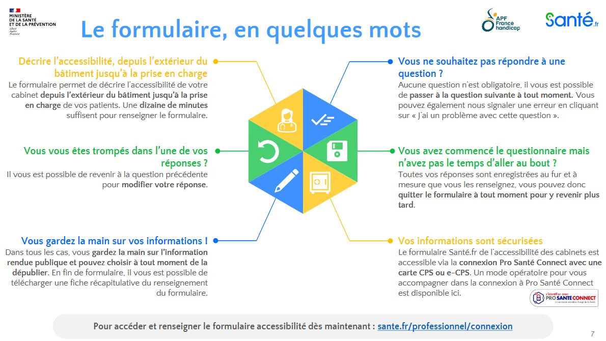 Parlez-vous la langue des signes ? Votre matériel permet-il d’accueillir un public obèse ? Avez-vous mis en place des rampes d’accès ? Êtes-vous formé à la prise en charge des personnes autistes ? Avez-vous des produits ou prestations dédiés aux personnes sourdes ou malentendantes ? Dix minutes suffisent, assure APF France handicap, pour remplir le formulaire qui servira à "éviter une demande de rendez-vous de la part d’un patient qui ne pourrait finalement pas être soigné et de pouvoir l’orienter vers le confrère adéquat". Ainsi, l’usager pourra, au travers d’un filtre et en fonction de son type de handicap (moteur, visuel, auditif, intellectuel, avec trouble du spectre autistique, psychique…), accéder à ces informations essentielles. "Cela va au-delà de l’identification d’un lieu accessible" car "santé.fr permettra également d’identifier les éventuelles pistes d’amélioration à mettre en place", explique Pauline Leduc, cheffe de projet régional des politiques d’inclusion au sein d’APF France handicap Pays de la Loire.