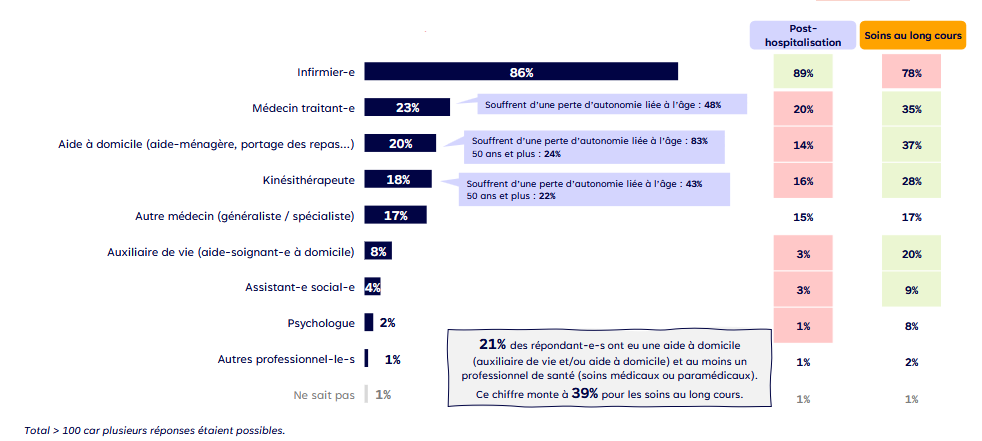 Parmi les répondants, 73% ont reçu des soins à domicile à titre ponctuel à la suite d'une intervention post-hospitalisation ou post-chirurgie ambulatoire. Et 23% ont reçu des soins au long cours, pour des motifs plus lourds, allant de la maladie chronique aux soins palliatifs. Principalement de professionnels de santé libéraux (pour 79% des sondés), ou d'un service de soins infirmiers à domicile (18%). Viennent ensuite une association et/ou un service d’aide et d’accompagnement à domicile (10%), l'hospitalisation à domicile (6%), les équipes mobiles de soins palliatifs (2%) ou encore un service polyvalent d’aide et de soins à domicile – Spasad, le futur SAD mixte) – (1%).