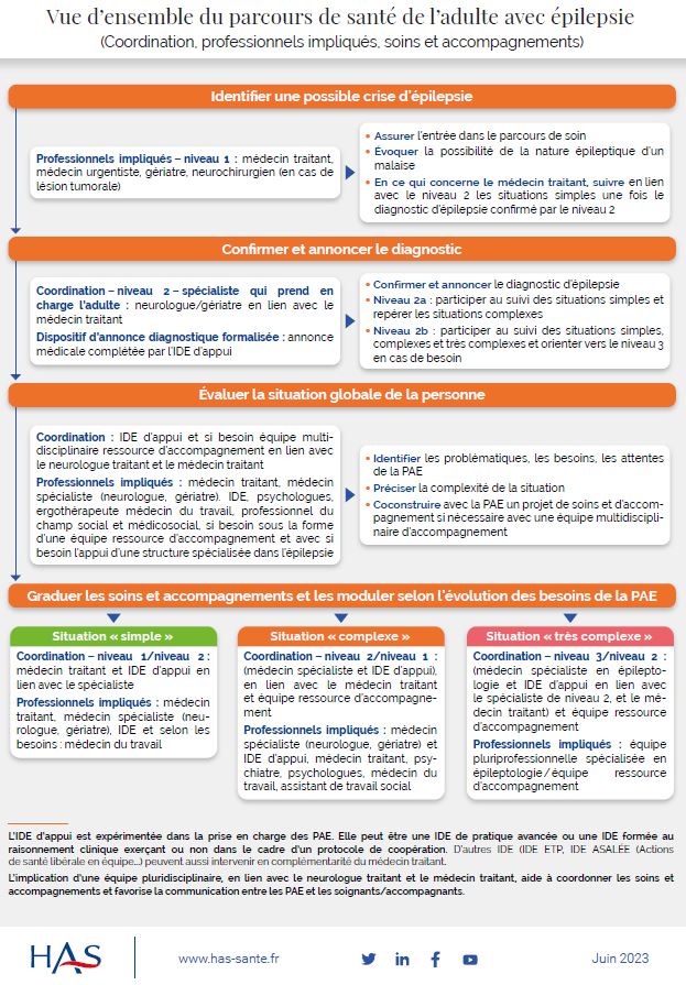 L’épilepsie, “perturbation du fonctionnement cérébral”, détaille-t-elle, est plurielle. Elle a des causes diverses : séquelles de traumatisme crânien, d’AVC, de problèmes infectieux, etc. ; des manifestations variées : crises plus ou moins récurrentes et visibles, sans ou avec comorbidités qui peuvent toucher tant les fonctions cognitives (mémoire, attention), que le psychologique (troubles anxiodépressifs) et aller jusqu’à des “tableaux de handicaps très sévères” ; elle a un impact plus ou moins fort sur le quotidien du patient et de ses proches. Pour mieux coller à ces situations diverses (et évolutives), la HAS a pensé un parcours en trois niveaux.