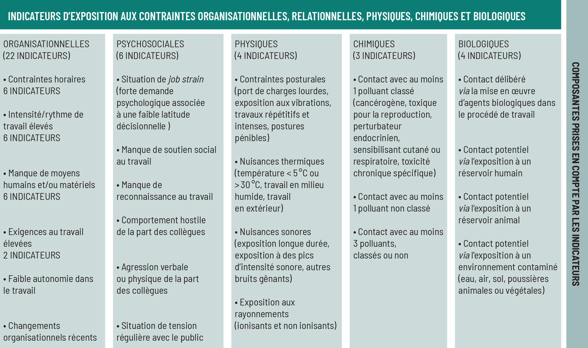 L’ensemble de ces expositions professionnelles, que l’on nomme également contraintes, sont classiquement regroupées en cinq catégories. Les contraintes chimiques concernent l’exposition d’un travailleur à des substances chimiques potentiellement dangereuses pour la santé, par exemple des produits cancérogènes tels que les émissions de moteurs Diesel, la silice cristalline ou l’amiante. Les contraintes biologiques se rapportent à l’exposition à des agents biologiques, comme des bactéries, virus ou moisissures susceptibles de provoquer une infection, une allergie ou une intoxication. Les contraintes physiques incluent les contraintes posturales, l’exposition au bruit, les contraintes thermiques (travail par fortes chaleurs ou en chambres froides) et l’exposition aux rayonnements (ultraviolets ou ionisants). Les contraintes organisationnelles regroupent, entre autres, les problématiques liées aux horaires ou au rythme de travail, celles liées au manque de moyens (matériels et humains) ou dues à des modifications fréquentes de l’organisation du travail. Les contraintes relationnelles (ou psychosociales) se rapportent essentiellement au ressenti du travailleur et décrivent notamment des situations de job strain (situation de tension caractérisée par une forte demande psychologique et une faible latitude décisionnelle) et les situations de tensions interpersonnelles au sein des collectifs de travail (collègue, supérieur hiérarchique) ou vis-à-vis du public.
