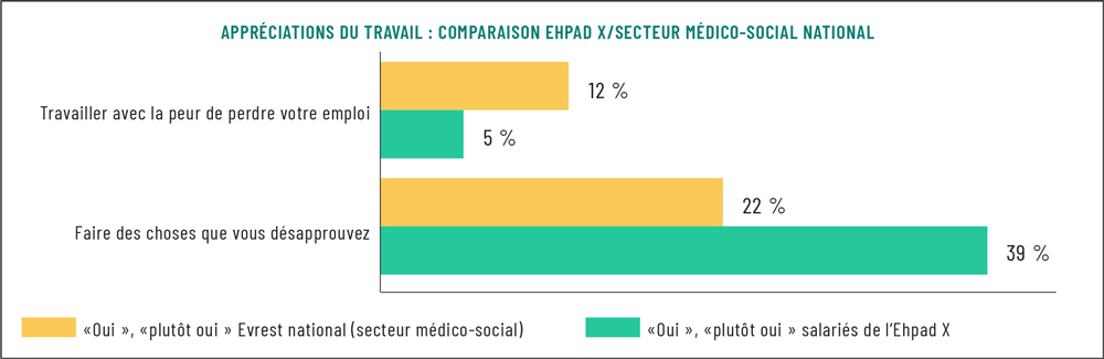 Ainsi, à la question "Faire des choses que vous désapprouvez", 39 % des salariés interrogés répondent "oui" ou "plutôt oui" (contre 22 % à l’échelle nationale dans le secteur médico-social). Le relevé des verbatims permet à l’équipe de l’Opsat d’expliquer à l’employeur ce que représente cette réponse à l’Ehpad : elle est en lien avec la qualité empêchée ("Ne pas pouvoir prendre en charge les résidents comme les salariés pensent devoir le faire").