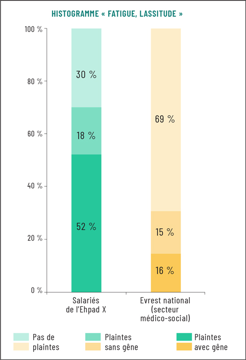 Evrest permet également aux professionnels de la santé au travail de disposer de données de santé. Concernant cet établissement, les données de santé confirment le ressenti de Séverine Jacques à l’occasion des entretiens périodiques, en apportant cette fois une quantification objective. L’histogramme (voir ci-dessous) montre le niveau de "fatigue, lassitude" des salariés ressenti à cette période : 52 % des salariés interrogés rapportent une fatigue, lassitude impactant le travail (contre 15 % à l’échelle nationale).