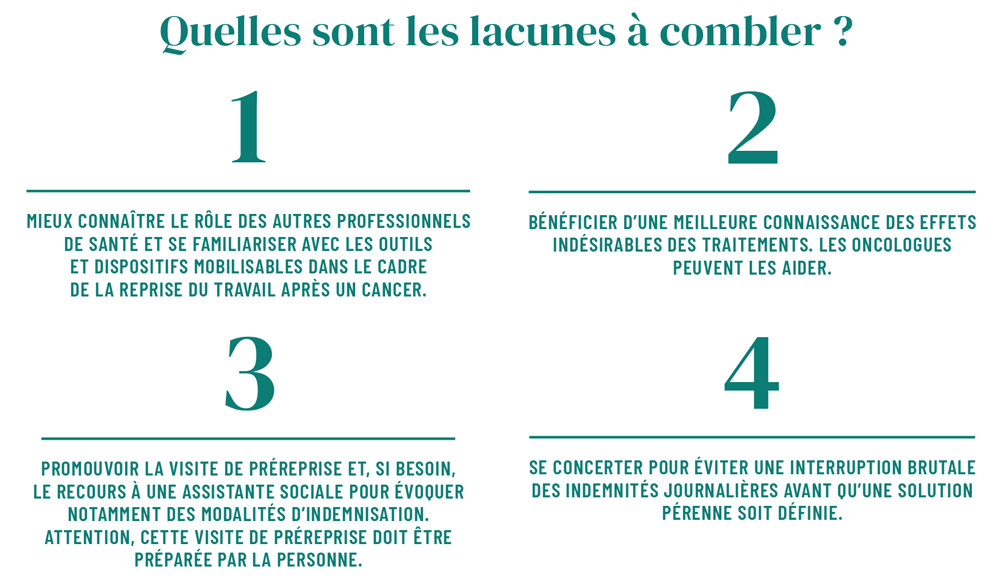 Pour favoriser le retour au travail d’une personne touchée par un cancer, l’intervention conjointe des différents professionnels de santé que sont l’oncologue, le médecin généraliste, le médecin du travail, l’assistante de service social et le médecin-conseil est indispensable. Cette coopération enrichit la compréhension de la situation, tant personnelle que professionnelle, de la personne concernée, pour une action plus efficace, à son bénéfice comme à celui de son collectif de travail.